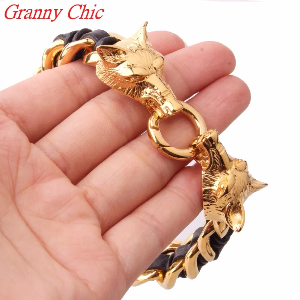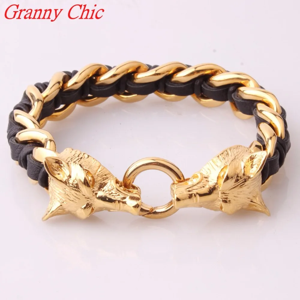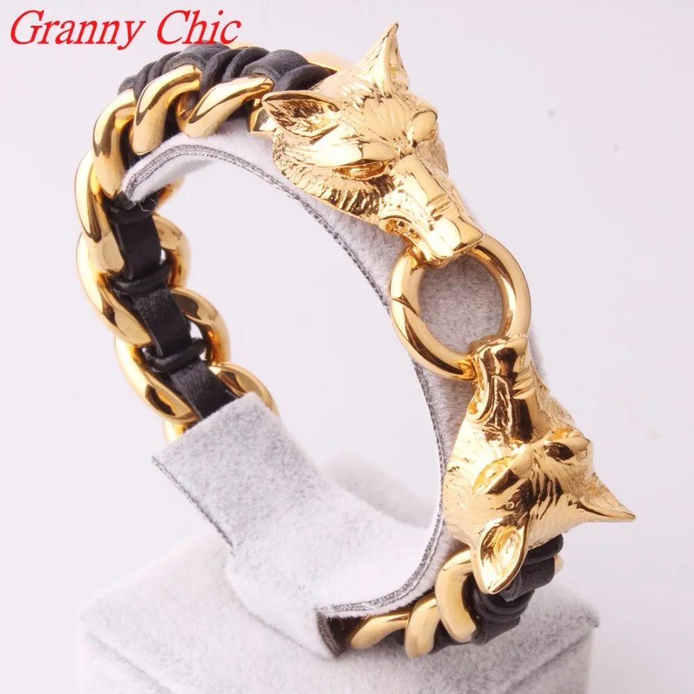 Review Granny Chic Cool Stainless Steel Gold Wolf Bracelets Bangles High Quality Black Genuine Leather Bra