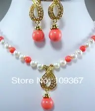 HIGH QUALITY Noblest lady's gift fine Amazing White Pearl&Pink Shell Pearl Necklace Earring18K shipping free 925