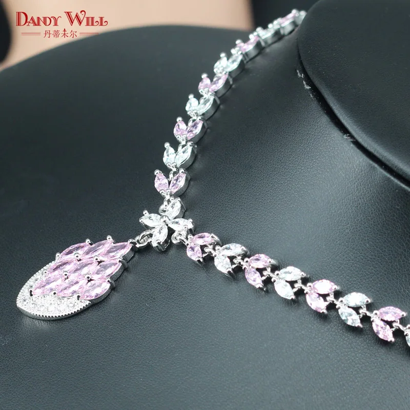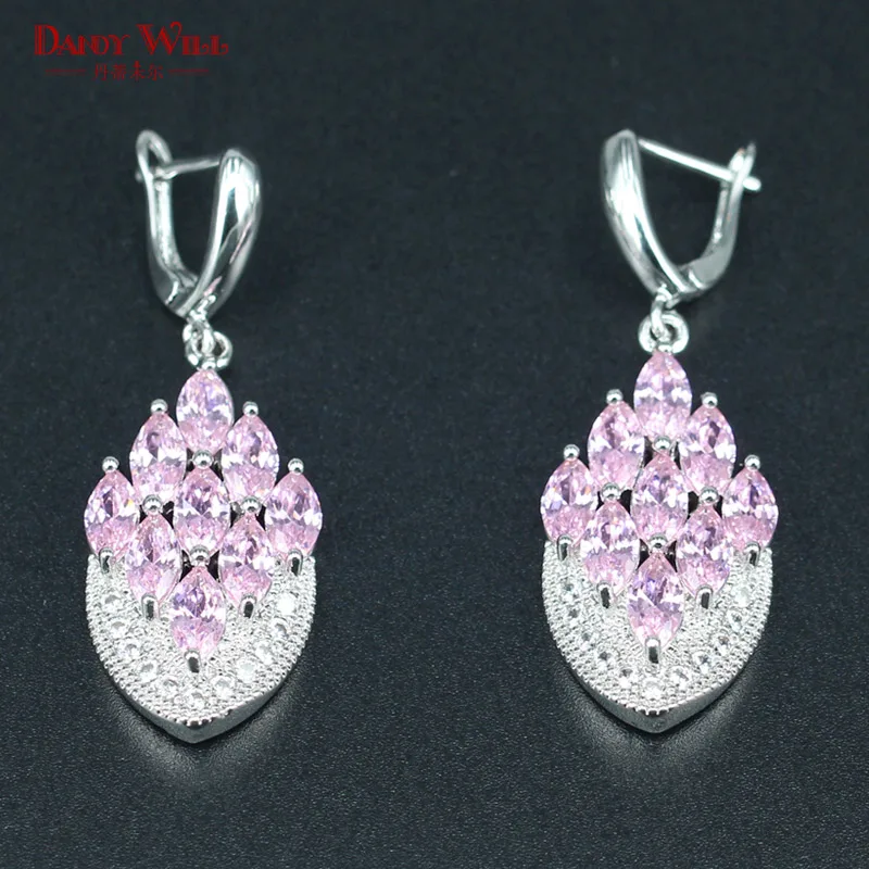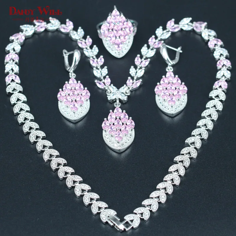 Best Quality Pink CZ 925 Silver Color Wedding Jewelry Sets For Women White Crystal Pendants Earrings Necklace Ri