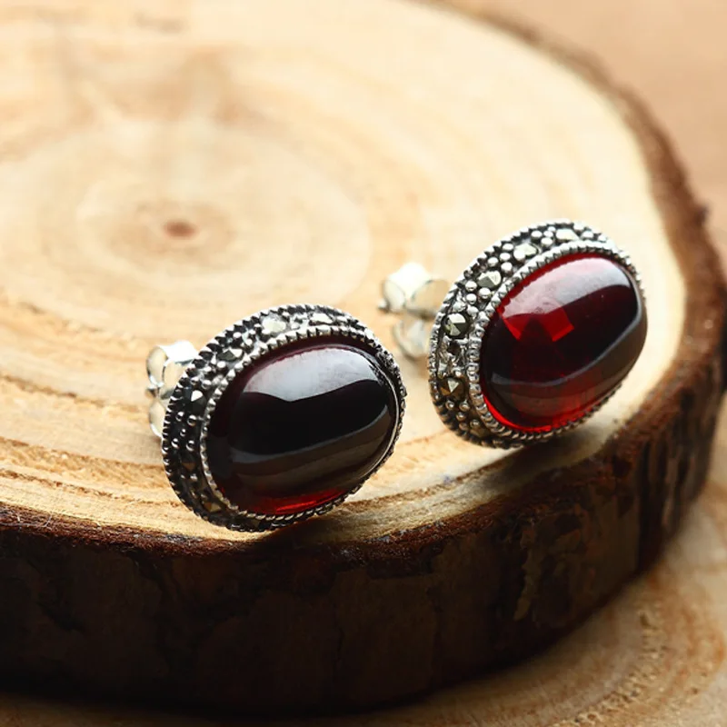 ORIGINAL authentic 925 Sterling silver Retro oyal palace style red Natural semi-precious stones girls Garnet